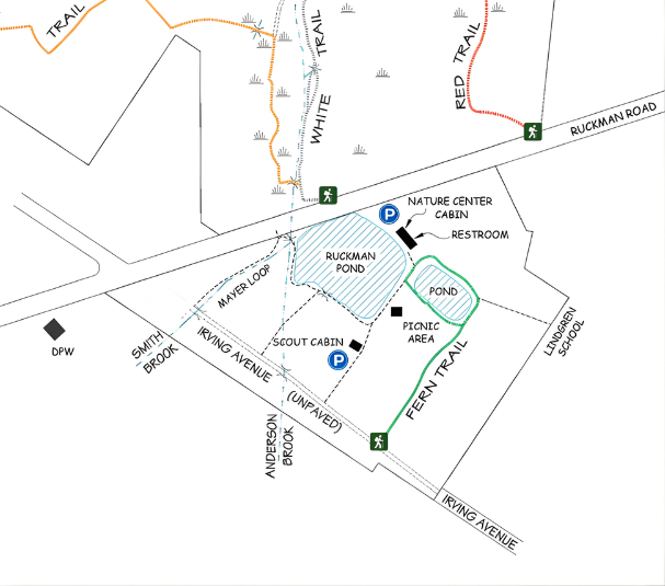 Limited parking is available at our parking lot by the Nature Center Cabin at 154 Ruckman Road, Closter NJ. Please park diagonally, facing Ruckman Pond. In the case that the parking lot is full, it is legal and recommended to park along Ruckman Road. Additional overflow parking is available at the end of Irving Avenue—follow the street until it becomes a dirt road, then turn right at the end.
